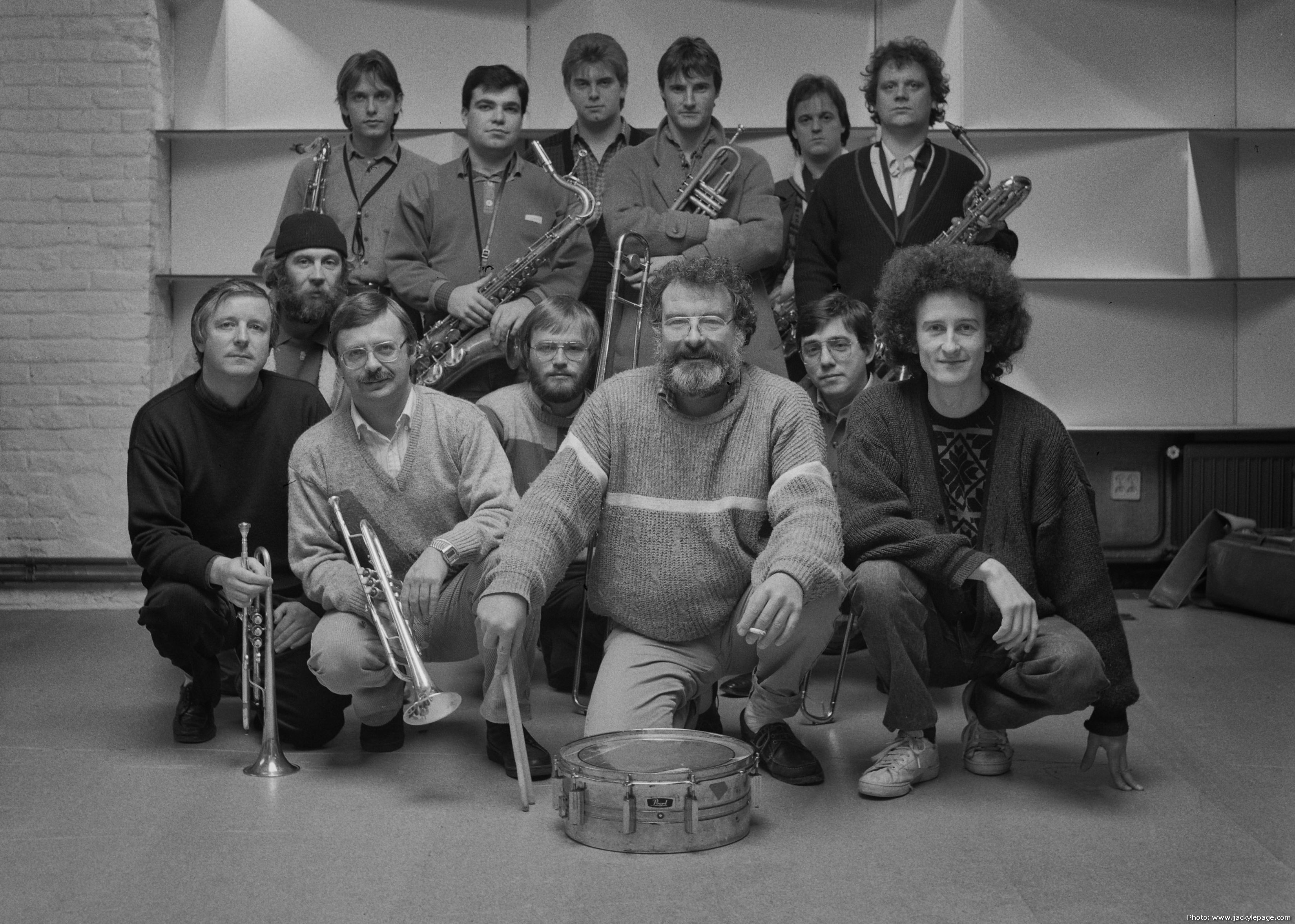 with US saxophonists Joe Lovano and John Ruocco appearing as guests. Basic band (without the guests) : 1st row : Richard Rousselet (trumpet), Eric Verhaeghe (trumpet), Félix Simtaine (drums, leader), Michel Herr (piano, musical director) 2nd row : Jean-Pol Danhier (trombone), Marc Godfroid (trombone), Paul Bourdiaudhy (trombone) 3rd row : Erwin Vann (tenor sax), Kurt Van Herck (tenor sax), Serge Plume (trumpet), Bert Joris (trumpet), Peter Vandendriessche (alto sax), Johan Vandendriessche (baritone sax) Not present on the photo : Philippe Aerts (double bass) Igloo/Daylight studio, Brussels, November 1986. Photo : www.jackylepage.com |